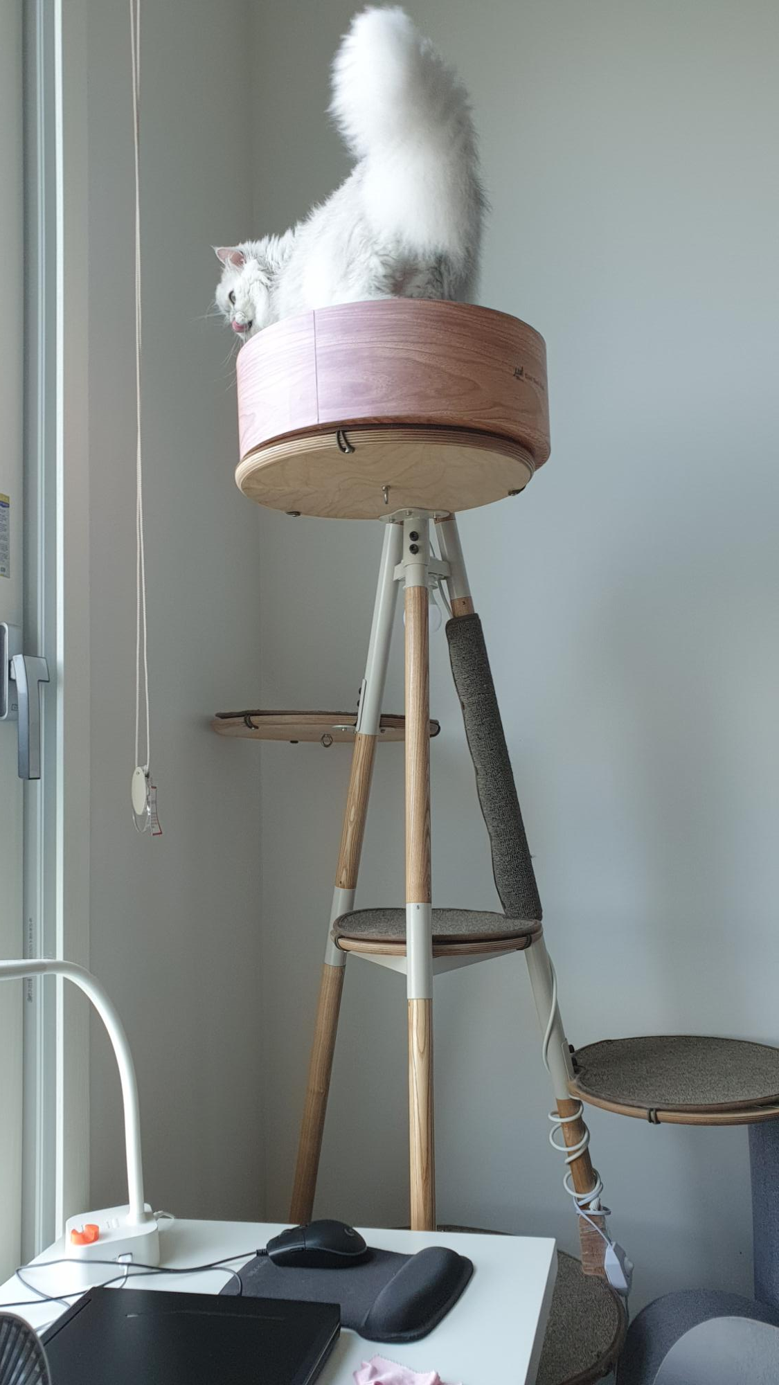 창문 근처에 캣 타워를